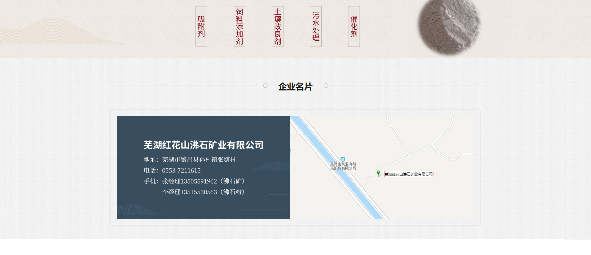 蕪湖紅花山沸石礦業(yè)有限公司距繁昌縣約18公里,有公路直達(dá)礦區(qū),距滬銅鐵路線的繁昌站、楓香墩站約20公里,礦區(qū)西側(cè)的赤沙河道直通荻港至長(zhǎng)江,水路交通地理位置好。沸石是硅氧、鋁氧四面體構(gòu)成的架狀硅酸鹽,有較大的比表面積和孔體體積。我礦沸石經(jīng)321、803地質(zhì)隊(duì)勘探儲(chǔ)量約一億噸以上,主要為絲光沸石(Ca、Na、K2)【ALSi2O2】27H2O,此外還含有石英、蒙脫石等,經(jīng)合肥工業(yè)大學(xué)、蕪湖市科委、華東冶金地質(zhì)礦產(chǎn)研究所、南京地礦研究院等單位測(cè)試測(cè)定沸石含為55%—68%。